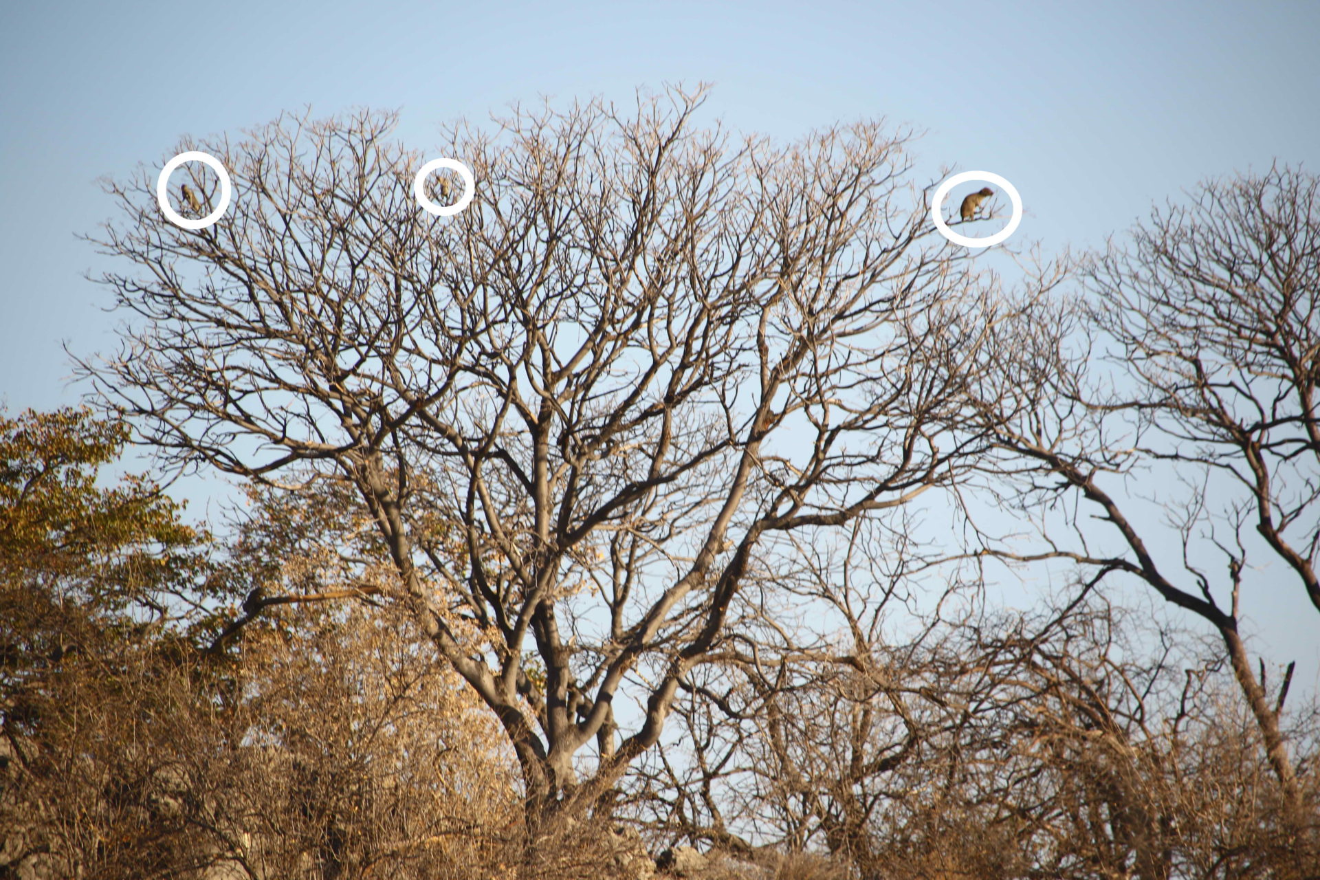 Life has been tough for Ongava’s animals and plants during this year’s extraordinary drought, the worst since 1980 and 1981. We expect lots of plants to die, and many animals have doubtless moved elsewhere or remained underground until the rains return. Animals need to balance the risk between eating or being eaten when they venture out to feed. Rock hyraxes normally feed on the ground close to their rocky homes, but in the absence of nearer food these daring hyraxes also require a good deal of physical balance while munching new shoots at the top of White syringa (Kirkia acuminata) trees. Steadying themselves on flimsy branches 10 and more metres above the ground, they would be easy quarry for Martial and Verreaux’s Eagles, both of which are breeding on Ongava at the moment.