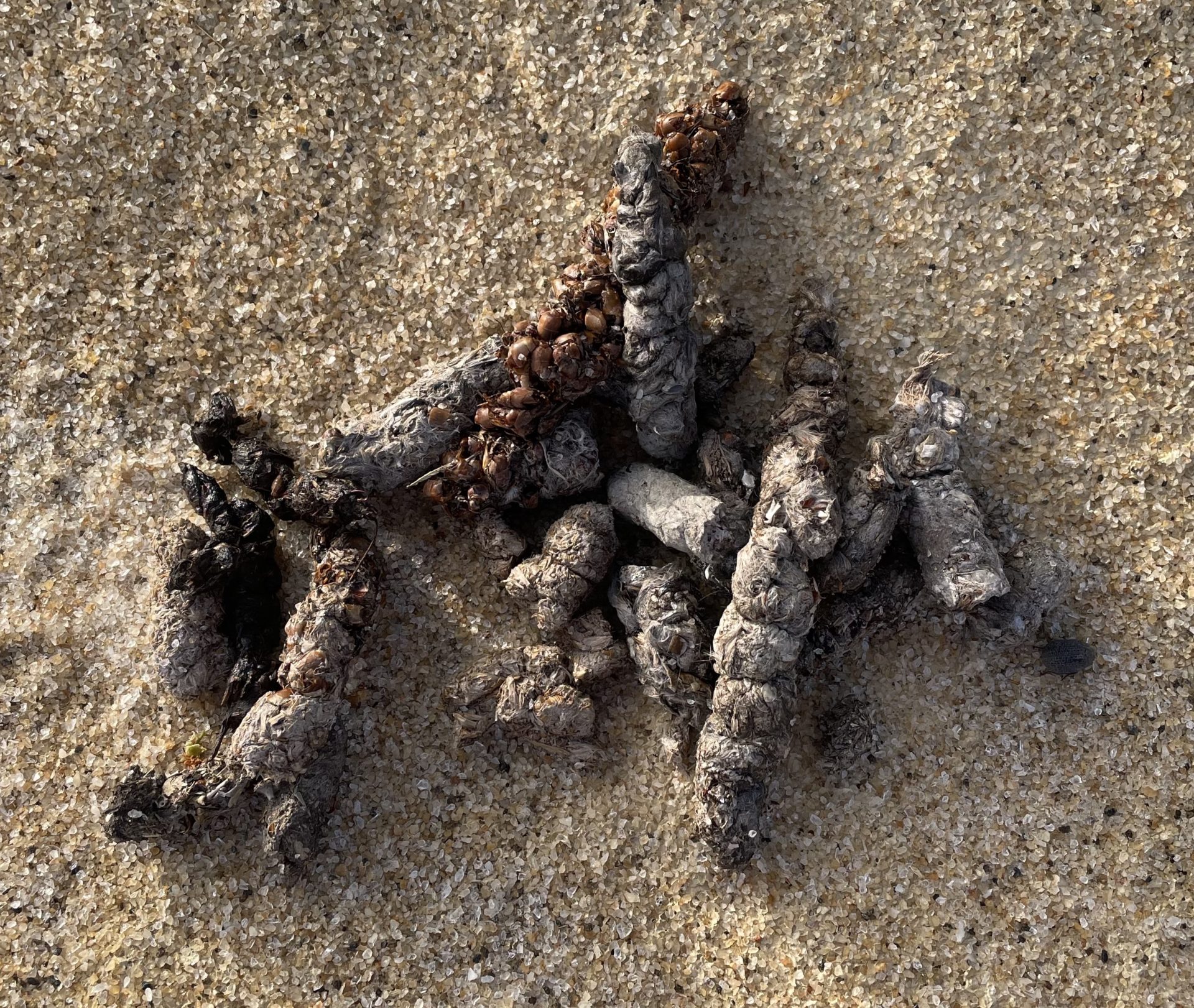 Genet scats showing the typical carnivore scat shape, hairs and berry contents