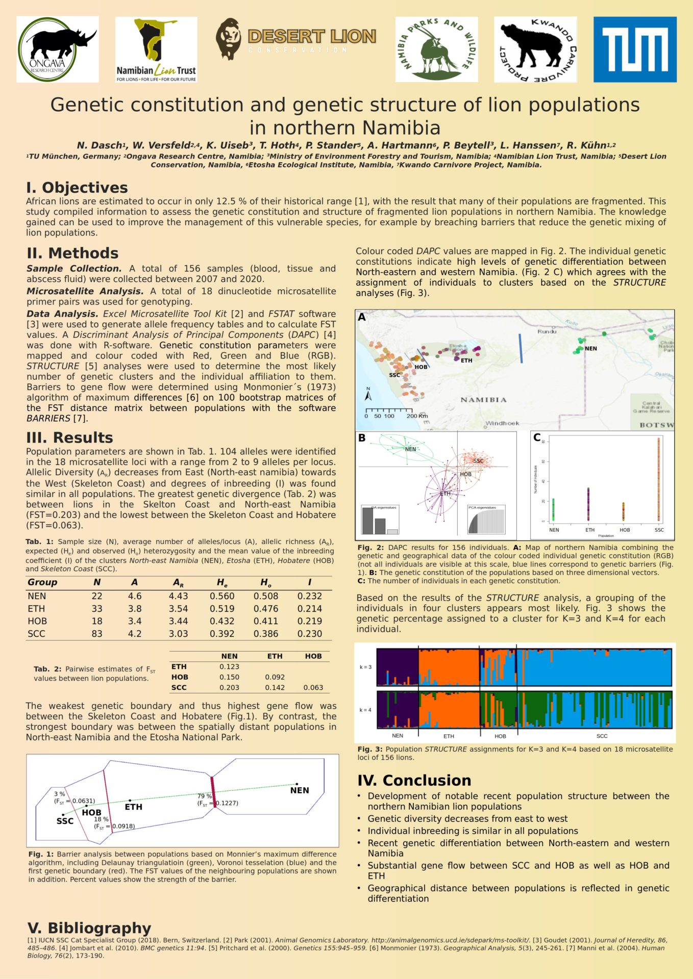 African lions are estimated to occur in only 12.5 % of their historical range, with the result that many of their populations are fragmented. This study compiled information to assess the genetic constitution and structure of fragmented lion populations in northern Namibia. The knowledge gained can be used to improve the management of this vulnerable species, for example by breaching barriers that reduce the genetic mixing of lion populations.