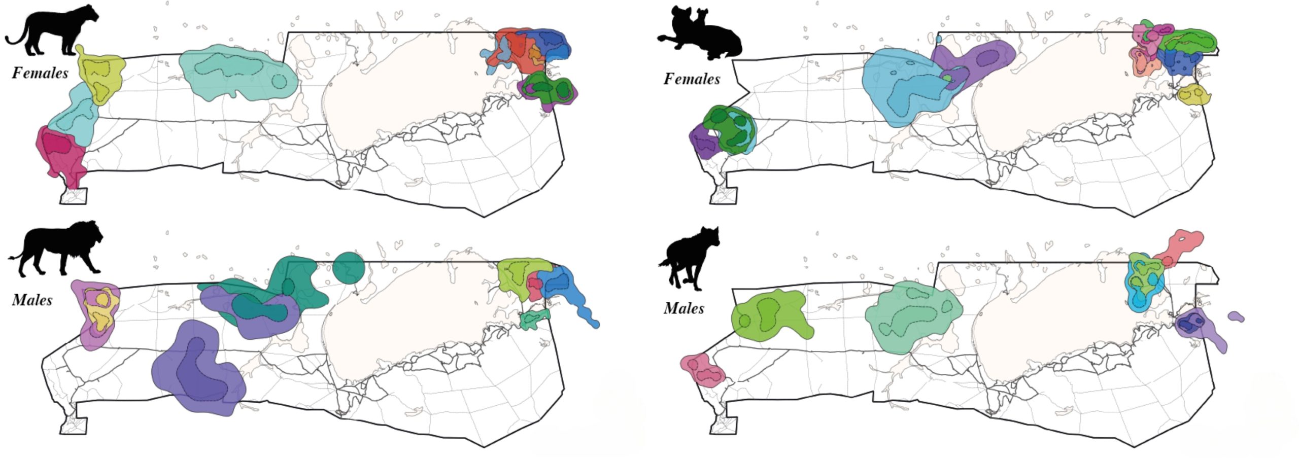 Since its inception in 2021, the GECP has amassed significant amounts of data - from tracking carnivore movements to genetic sampling. Below are estimated home range maps generated with data collected through collaring and tracking lions and spotted hyenas in Etosha National Park. These efforts are rapidly improving our understanding of carnivore species' populations. In 2024, the GECP partners and other collaborators conducted an extensive playback survey to estimate the size of lion and spotted hyena populations across the Landscape. A student-driven citizen science survey has also been trying to generate the first estimates of cheetah and leopard populations inside Etosha National Park. Student-driven research has been at the heart of the Programme's efforts. It has already facilitated the development and training of eight students, with almost another dozen more currently working towards a postgraduate degree, under the GECP umbrella. Overall, the Programme and its associates have also translated their work on the ground to scientific output. So far, the GECP has eight peer-reviewed publications, two popular articles and seven conference presentations to its name - with many more to come. You can head over to our publications page to have a closer look at some of the research that has come out of this collaborative project.